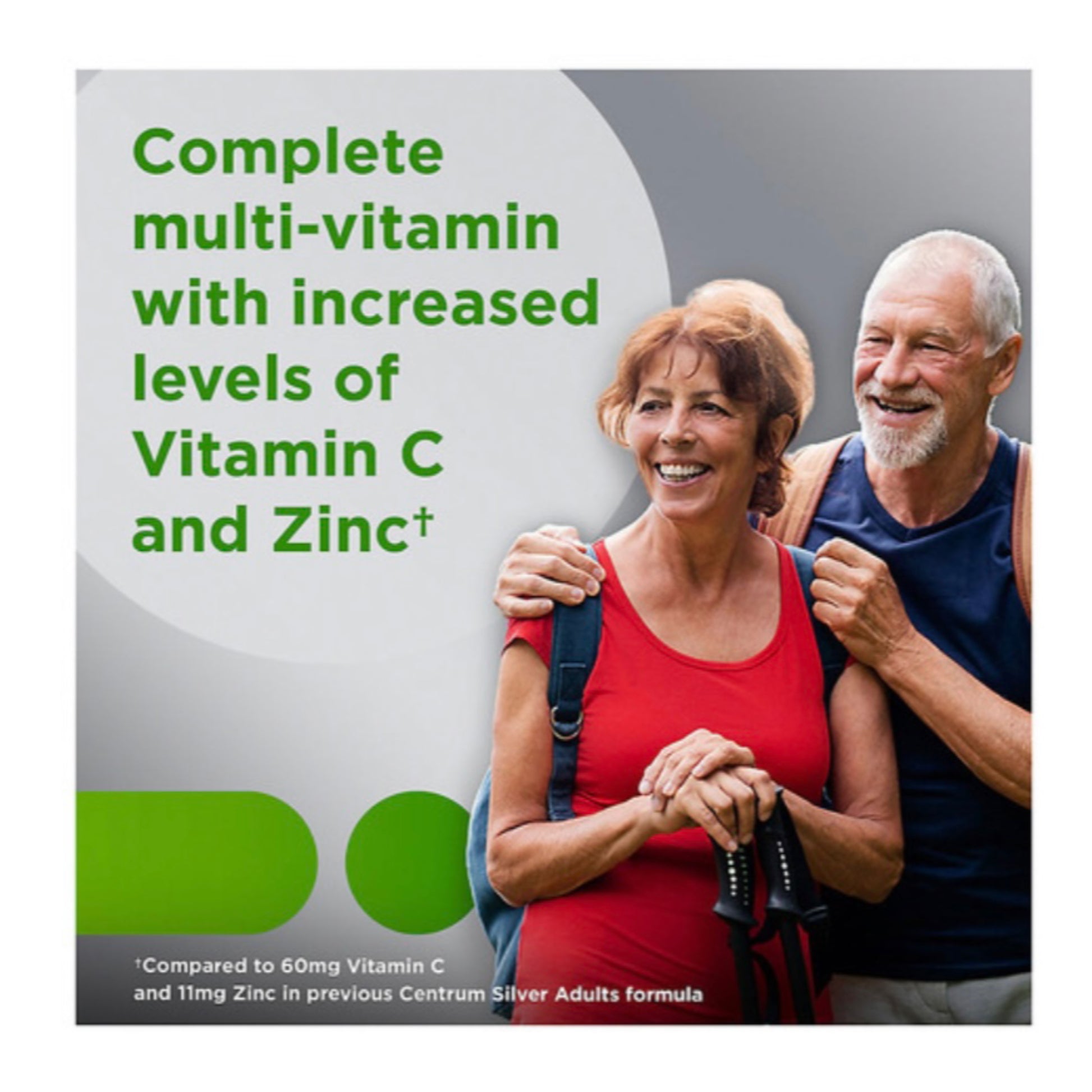 Centrum Silver Adultos 50+ está especialmente formulado para apoyar las necesidades nutricionales de las personas mayores de 50 años. Esta nueva y mejorada fórmula ahora incluye niveles más altos de Vitamina C y Zinc para fortalecer tus defensas.