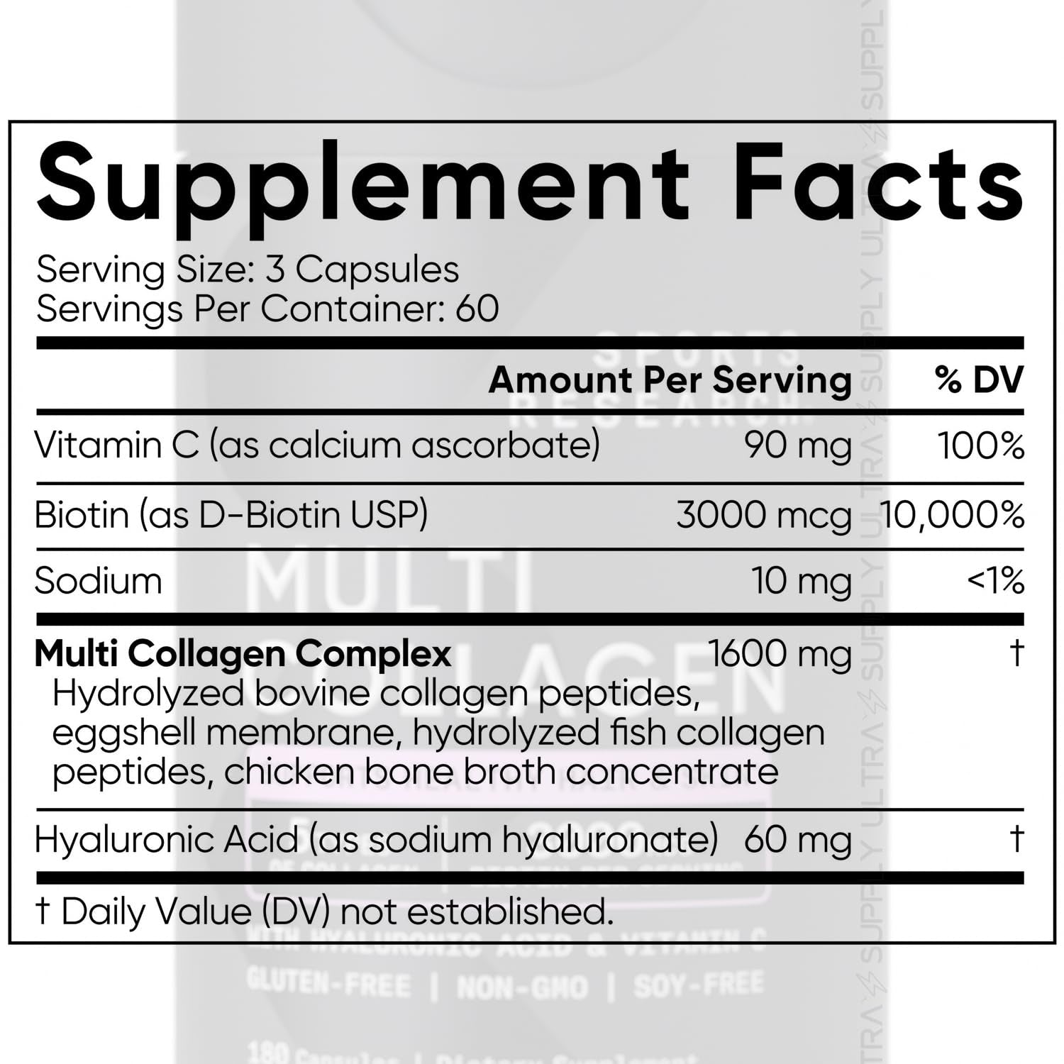 Multi-Colágeno: Piel, cabello y uñas radiantes. 5 Tipos de Colágeno, Biotina (3000mcg) y Ácido Hialurónico. ¡180 cápsulas, libre de gluten y OGM!