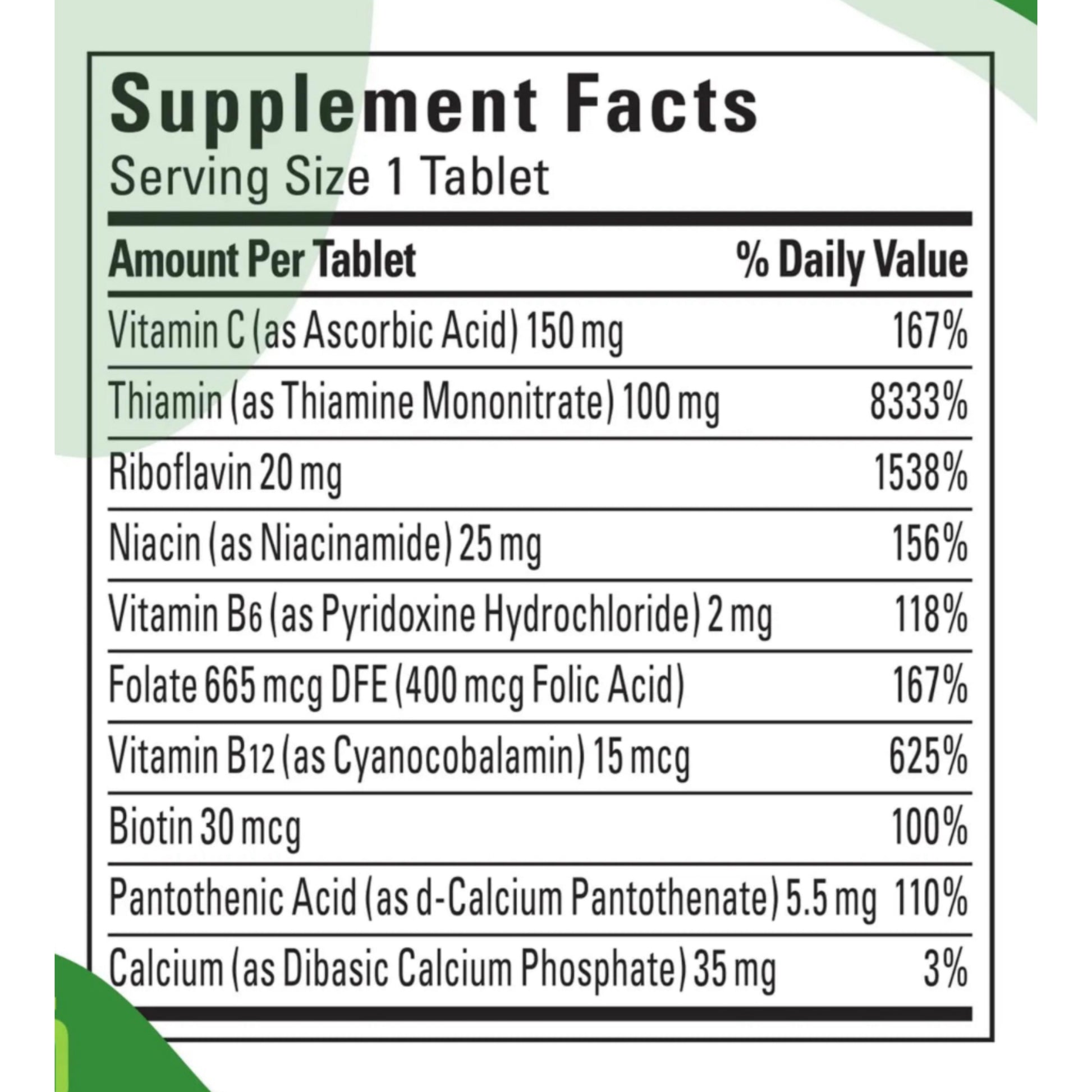 • Complejo B Completo: Contiene todas las ocho Vitaminas B esenciales (Tiamina, Riboflavina, Niacina, B6, Ácido Fólico, B12, Biotina y Ácido Pantoténico).