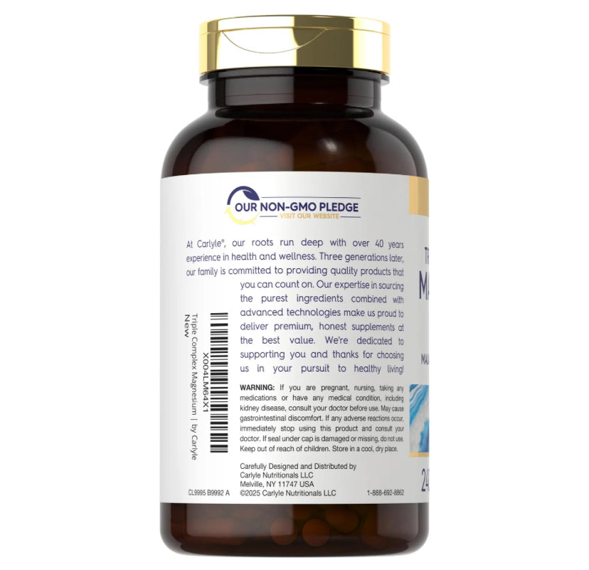 El Carlyle Triple Complex Magnesium es una fórmula avanzada diseñada para ofrecer una absorción superior y beneficios integrales. Al combinar tres tipos diferentes de magnesio — Malato, Glicinato y Citrato — este suplemento asegura que tu cuerpo aproveche al máximo cada dosis para el apoyo de los músculos, los nervios y la salud ósea.